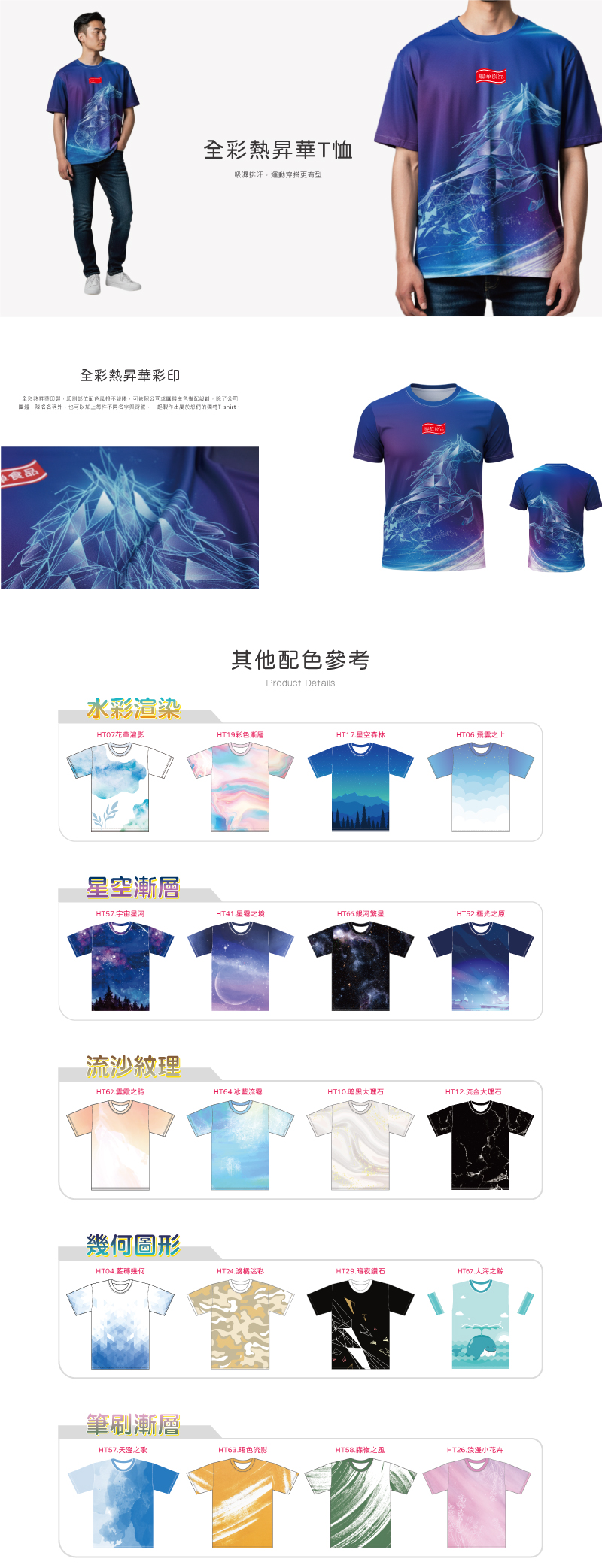 全彩熱昇華T恤 商品編號:S0001 材質:吸濕排汗鳥眼排汗布(100%POLYESTER) 商品介紹:全彩熱昇華印製,顏料滲入布料纖維中,零膠感不掉色,
