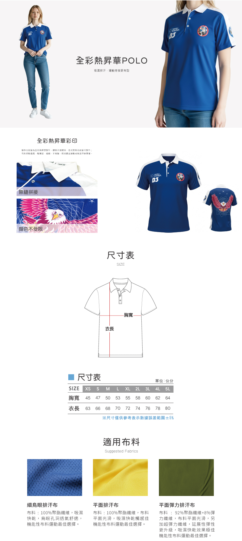 全彩熱昇華POLO衫 商品編號:S0003 材質:吸濕排汗鳥眼排汗布(100%POLYESTER) 商品介紹:全彩熱昇華印製,顏料滲入布料纖維中,零膠感不掉色,