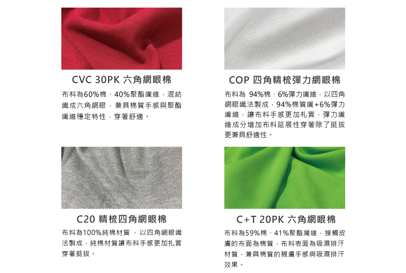 布料:CVC 30PK 六角網眼棉(60%棉+40%聚酯纖維) 衣服介紹:布料舒適,CVC材質適用於接觸焊接相關工作之團體,